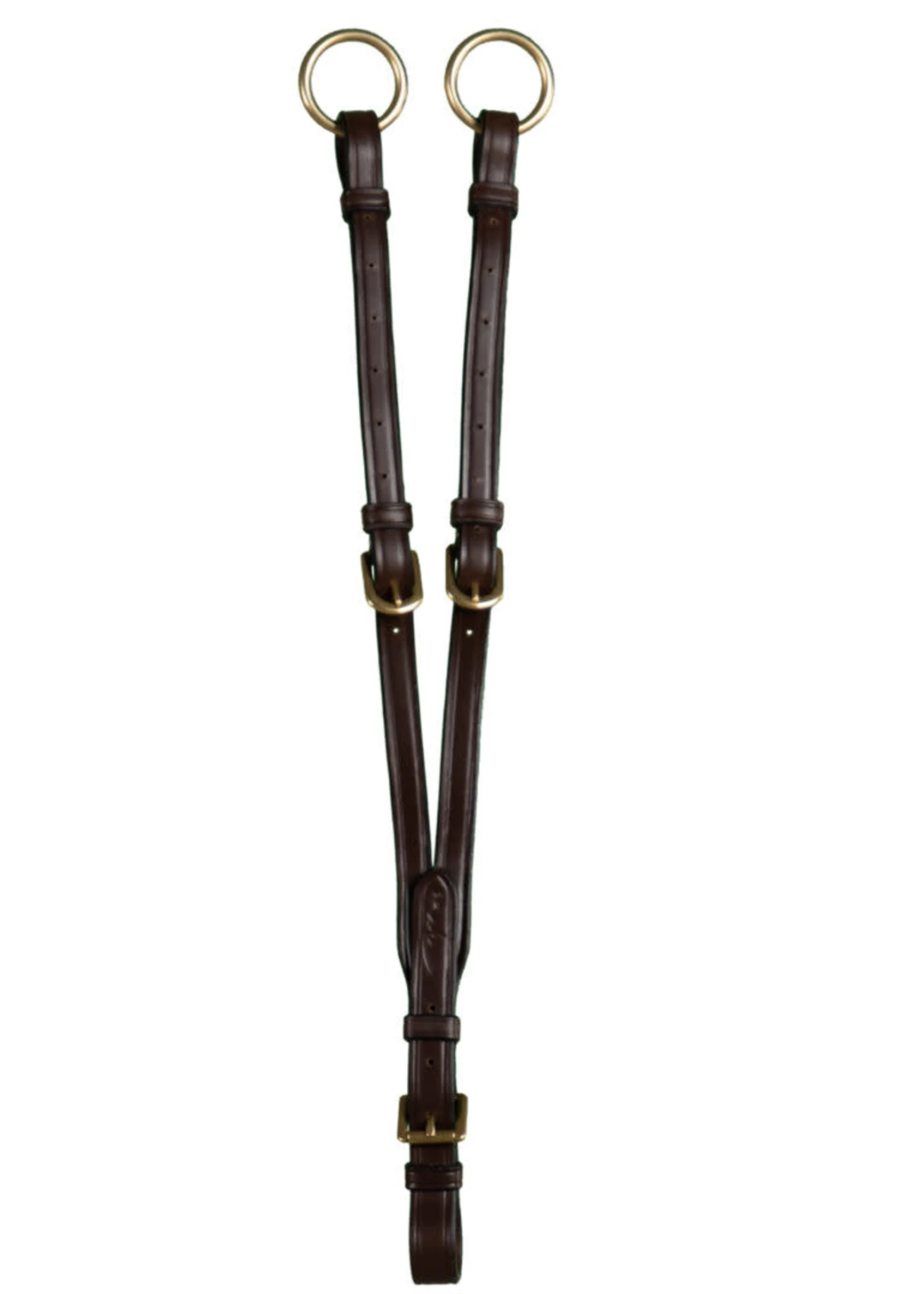 This running martingale attachment is from Dy’on’s D- Collection. It features Grade 1 Catalan leather, tanned in Spain, Designed in Belgium. This running martingale attachment is adjustable and designed to fasten to breastplate or yoke with its roller buckle. Cream color stitching and brass buckles are the signature features of this D-collection piece.