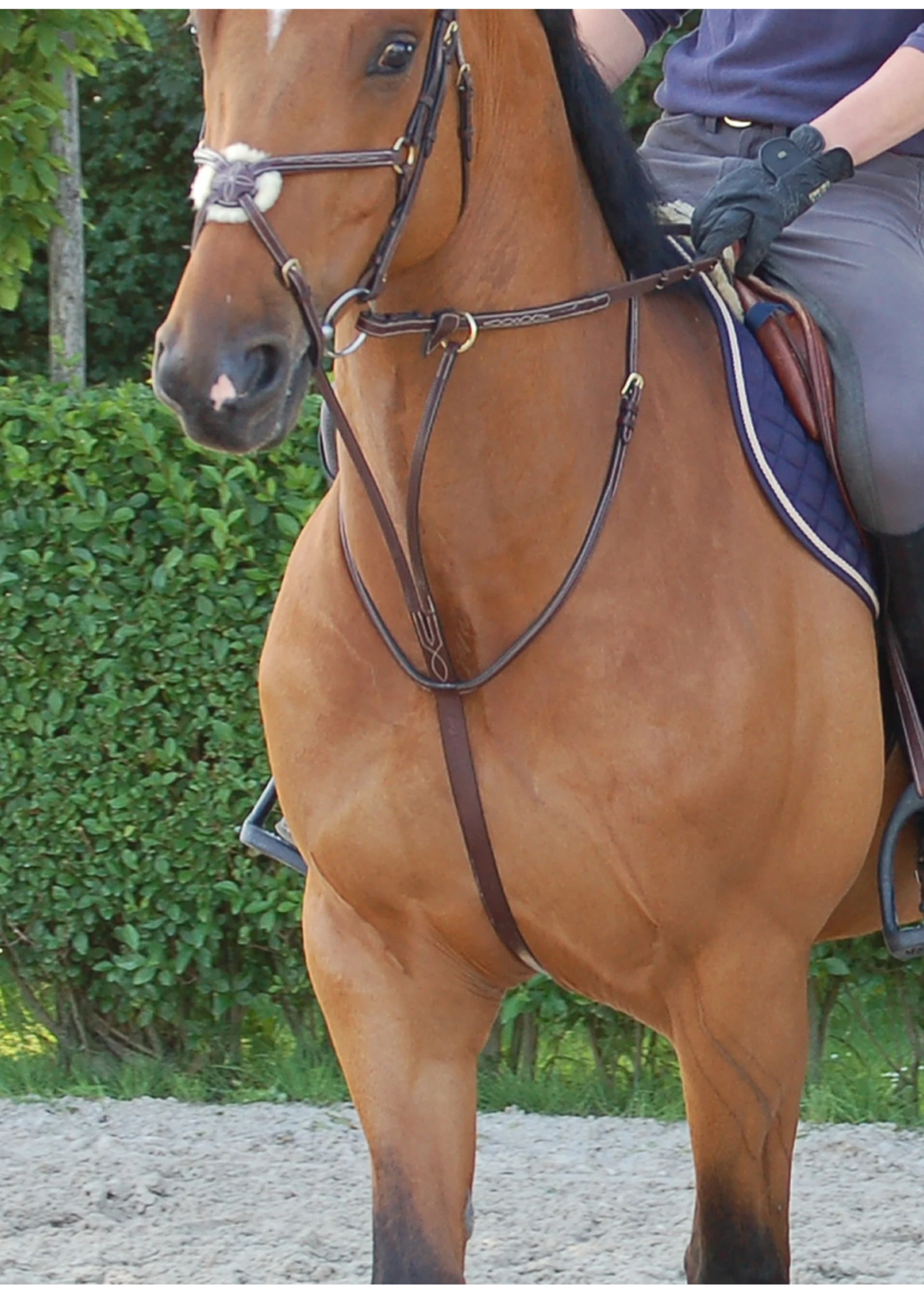 This Dy’on Running Martingale is from their D-Collection which features Grade 1 Catalan leather, tanned in Spain, designed in Belgium. The neck strap and branches are slightly square-raised. Fancy cream colored stitching and brass hardware makes this Dy’on martingale stand out in the jumper or equitation ring. The adjustable girth loop allows for accurate fit.