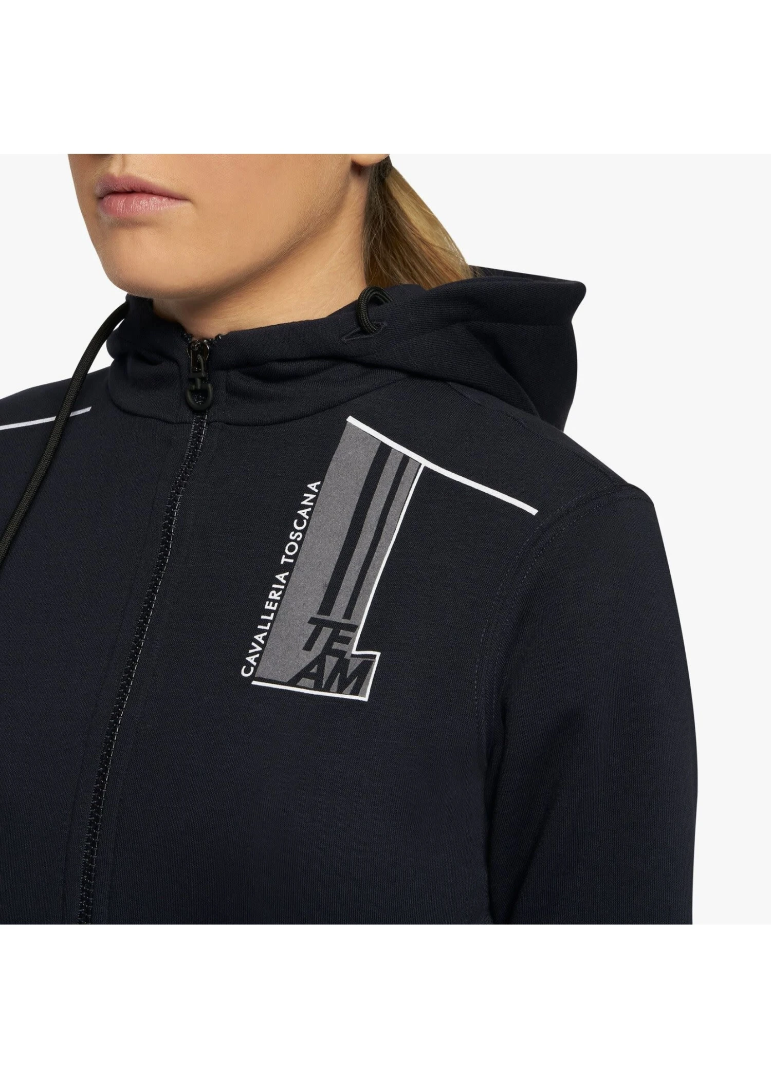This hoodie is comfortable to wear over t-shirts and shirts during horseback riding and everyday occasions. The model has a versatile and functional design with a comfortable adjustable hood, roomy kangaroo pockets and zip-puller closure in the shape of a logo. On the chest there is the Cavalleria Toscana Team print which gives an iconic and distinctive twist.