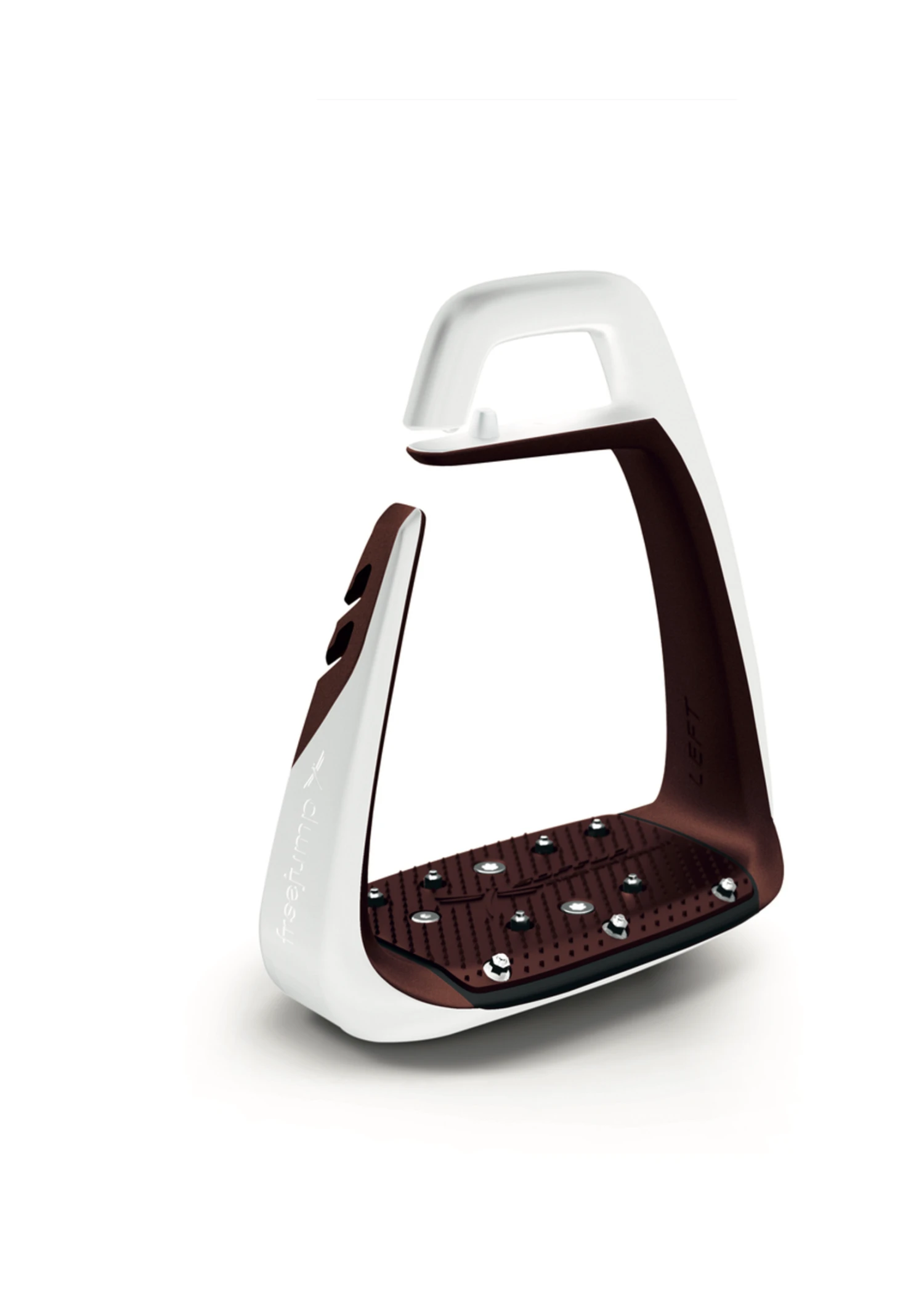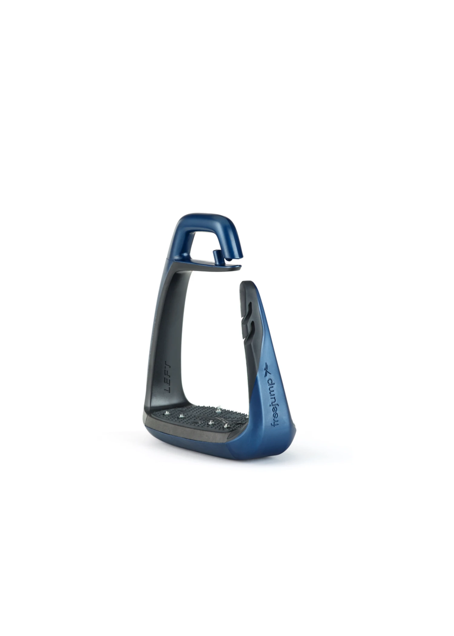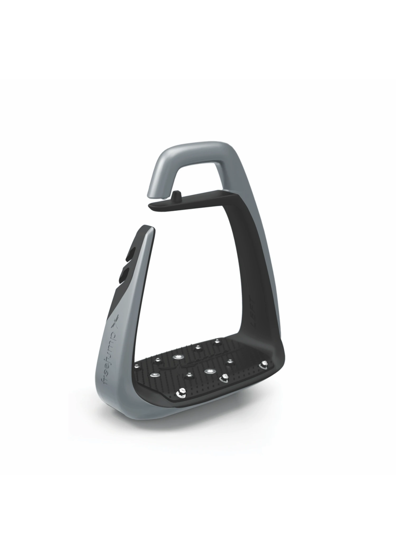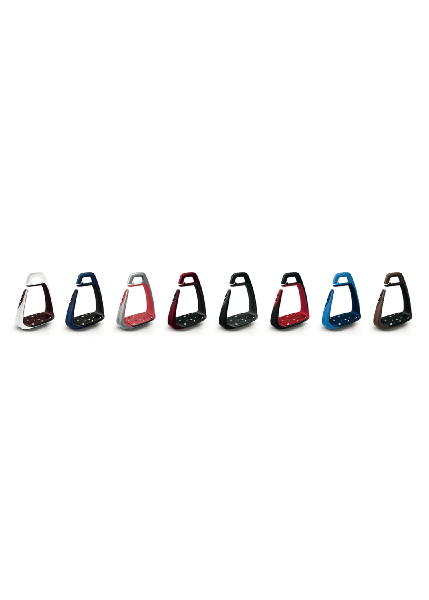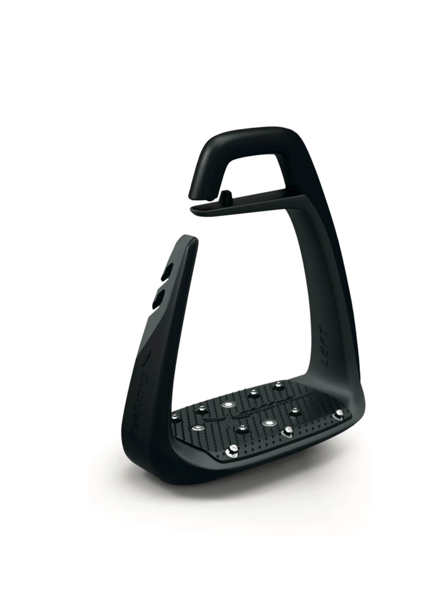 The Freejump “Soft Up Classic” stirrups feature an offset center of gravity, which aids in causing a rider’s heels to sink, carbon fiber grip, and a flexible side with quick release safety feature in case of fall. The stirrups also feature shock absorption which relieves pressure on the rider’s joints and horse’s back. The stirrups come in a variety of colors including the classic black and silver with different accent colors.