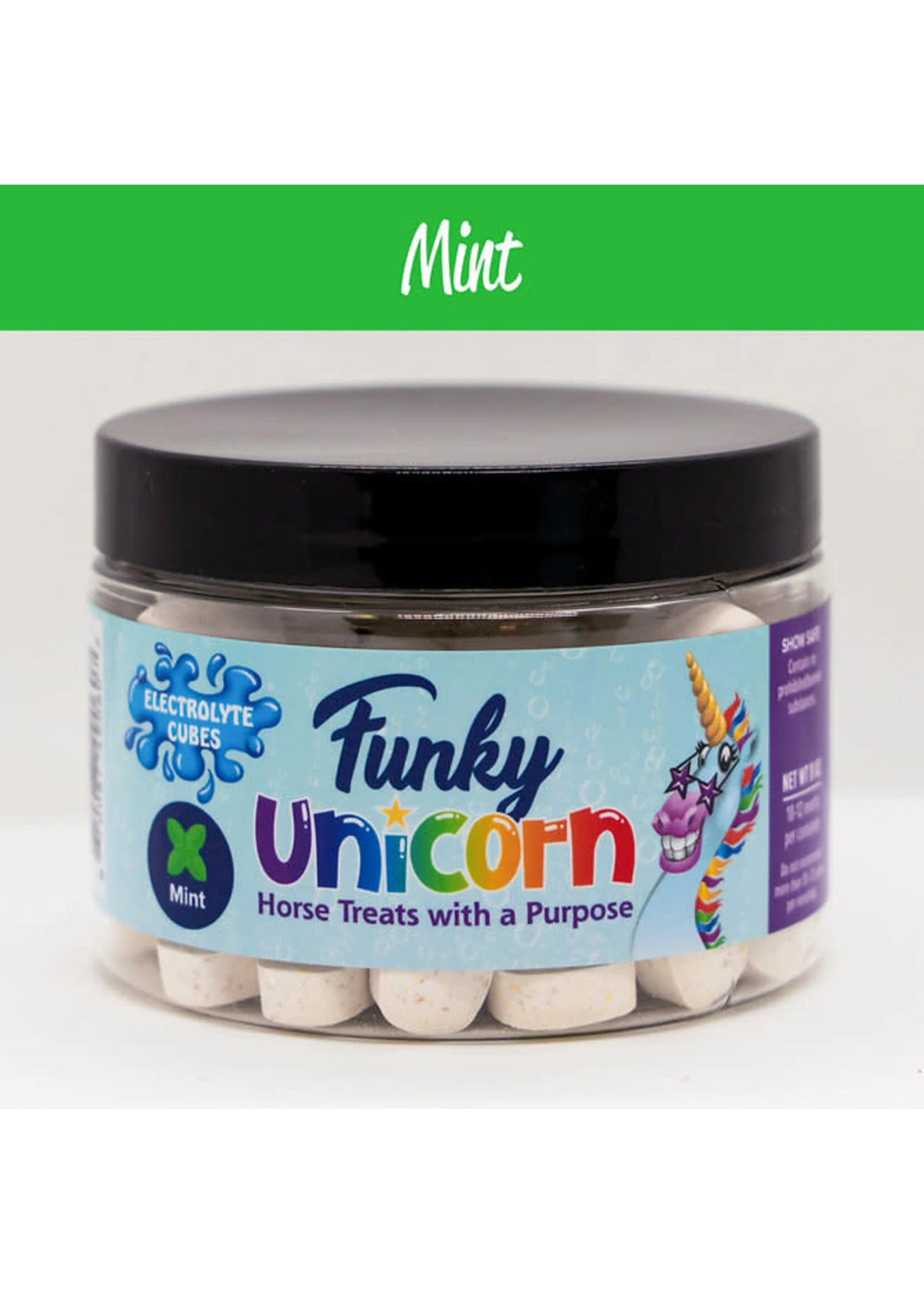 Funky Unicorn Electrolyte Cubes are manufactured to contain the precise amount of electrolytes in every single cube and are a mild electrolyte replacement. The Cubes are not meant to replace a current electrolyte program and are perfect to be given when your horse needs them most to recover and hydrate so are convenient to have on hand.