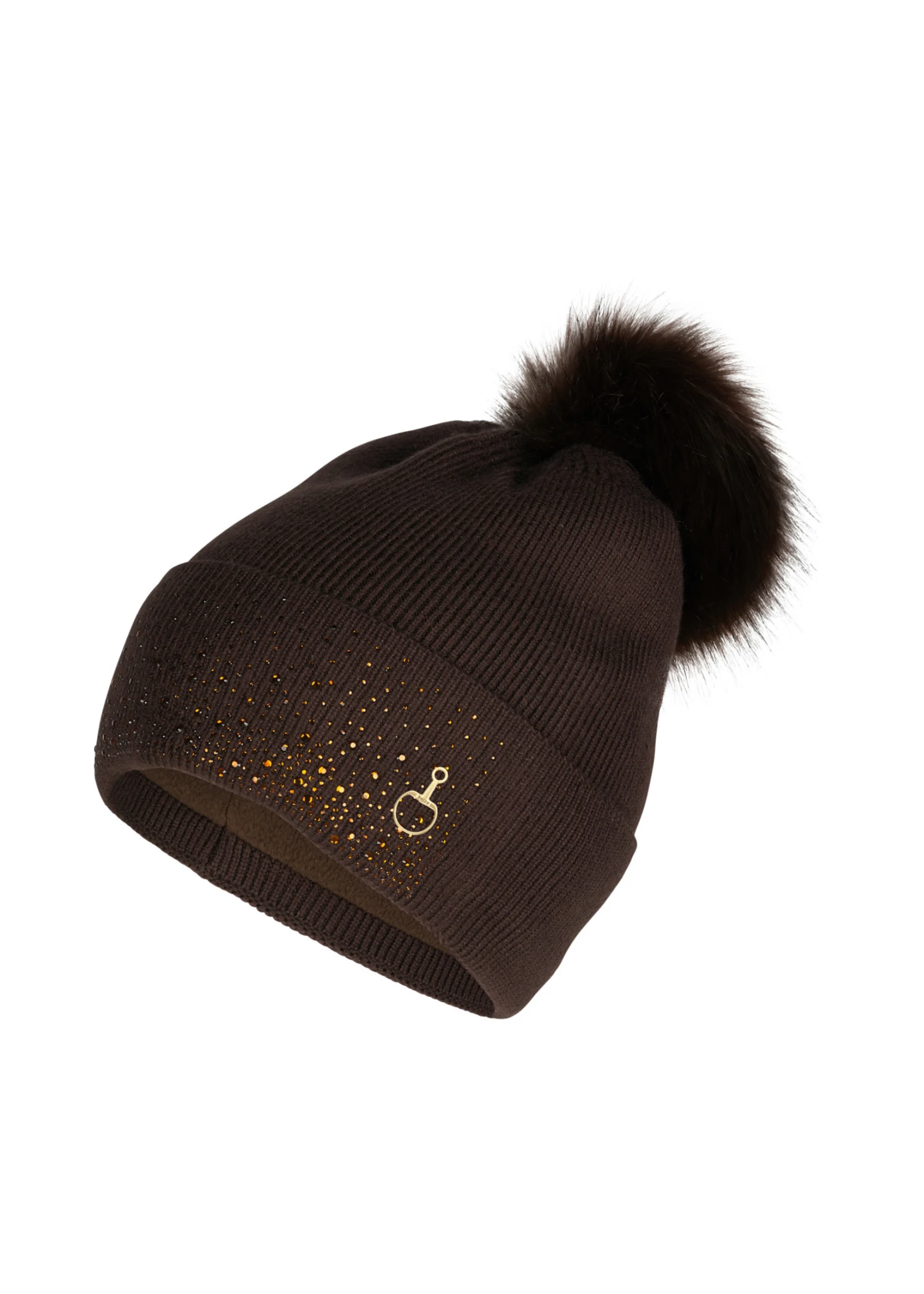 The new Leona hat is soft and lined with cosy fleece. Subtle crystals add a luxurious touch. A faux fur pom pom looks wintery, and the silver metal bit detail completes the rider look.