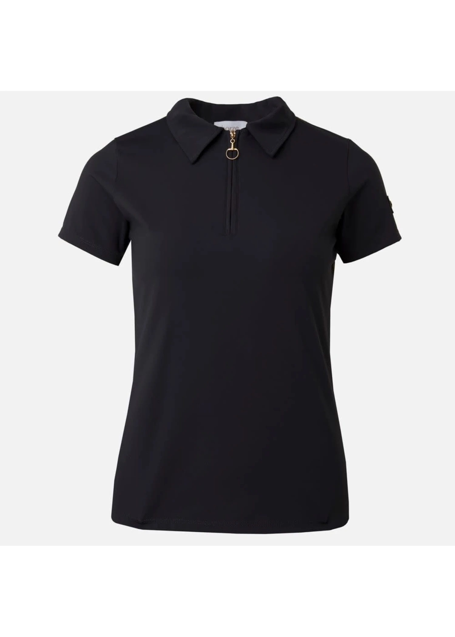 This breathable, quick-drying Horze Sagira training shirt is designed in a classic fit. The back is completely made from golden glitter fabric that adds a stunning detail. Lightweight material is great for training. The gold zipper opening provides extra ventilation.