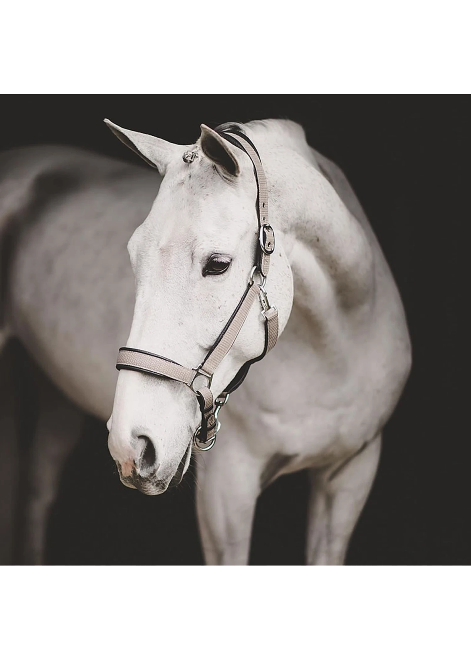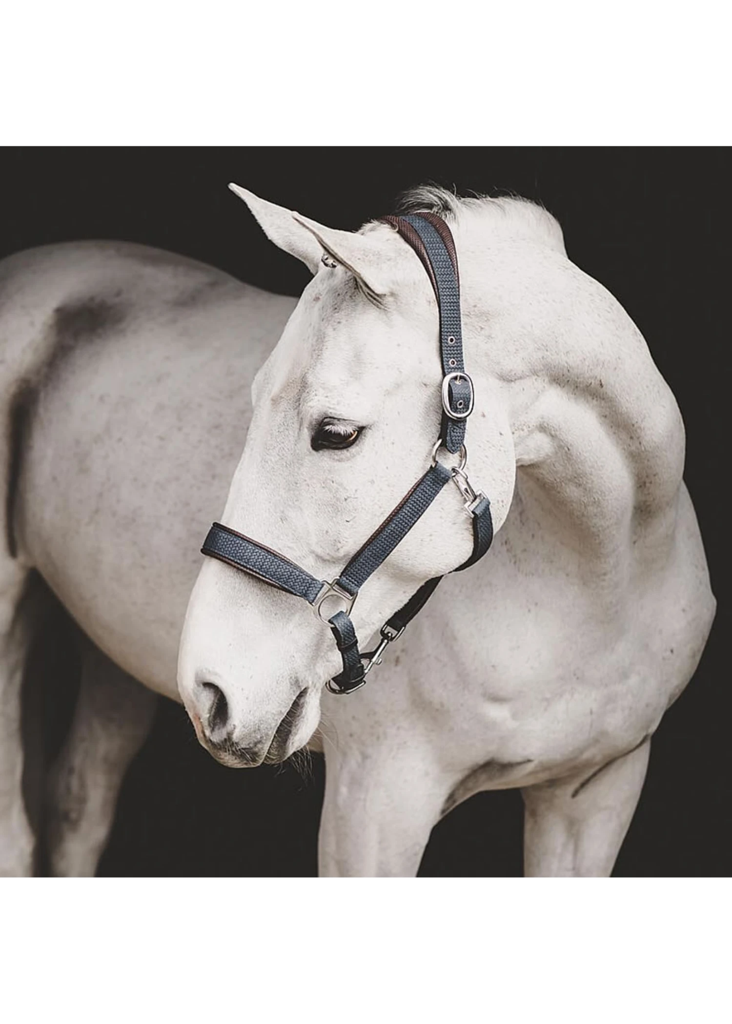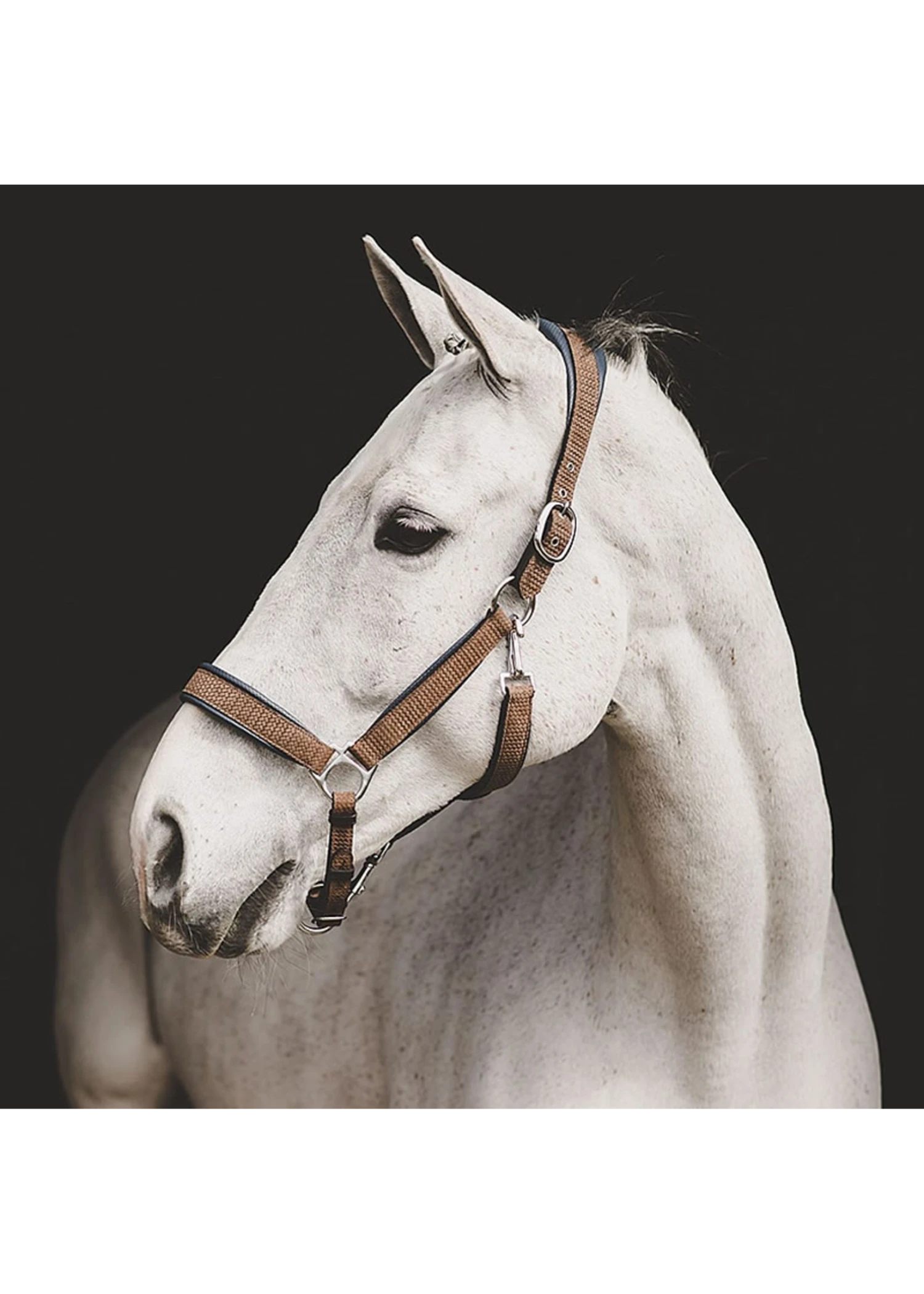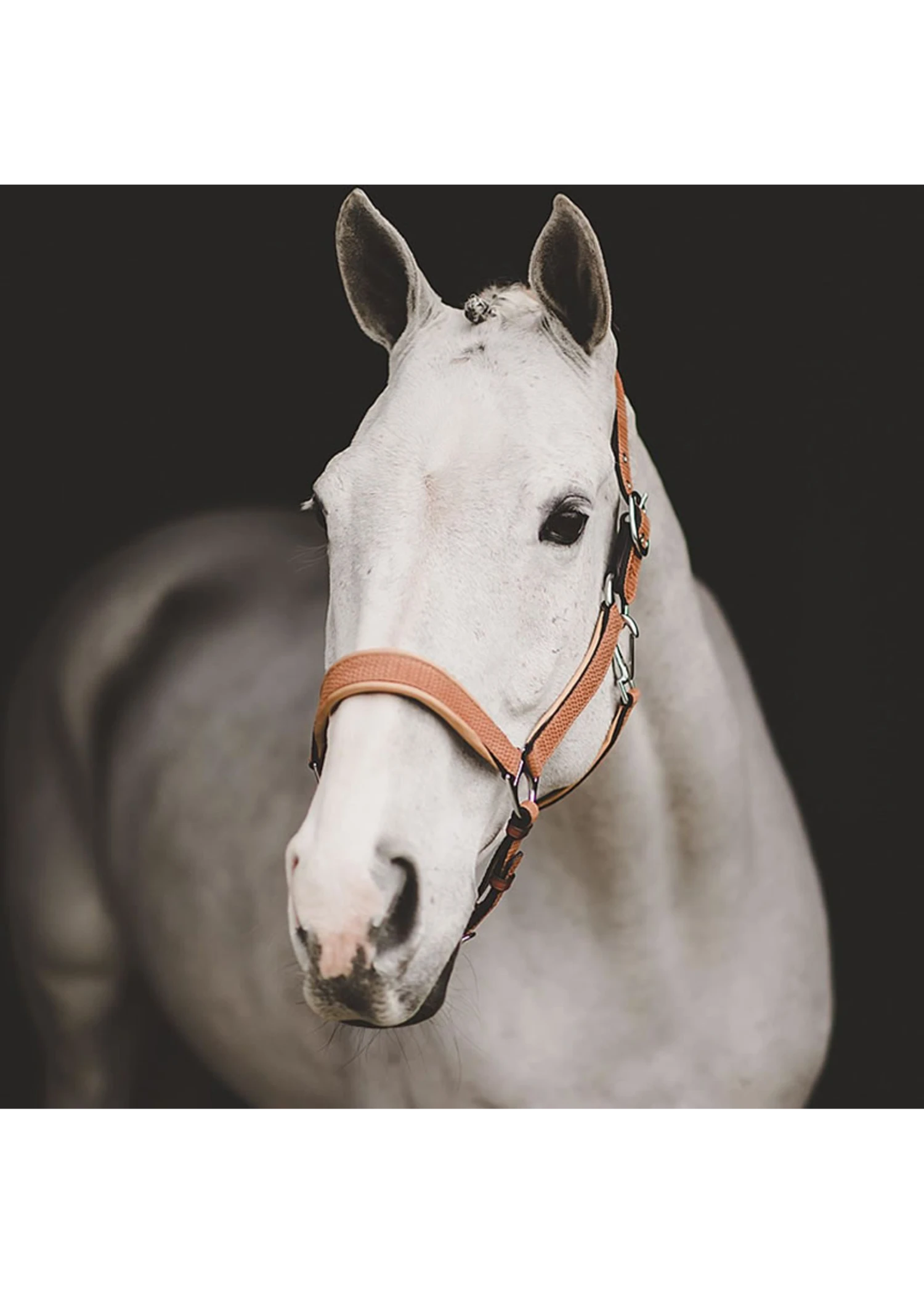 Dy’on leather halter with Nubuck “Basket” print, detachable throat piece, padded headpiece adjustable with buckles on each side, padded noseband