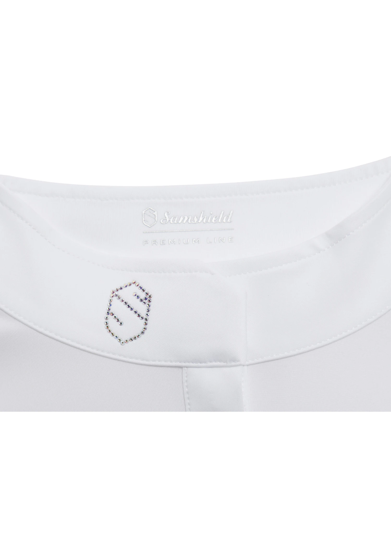 The Sophia top is made from ultra-soft and breathable stretch material with UV protection. The tapered style ensures a perfect fit. The collar is featured with a Samshield branded logo made from Swarovskiยฎ crystals and fastens up with small covered buttons.