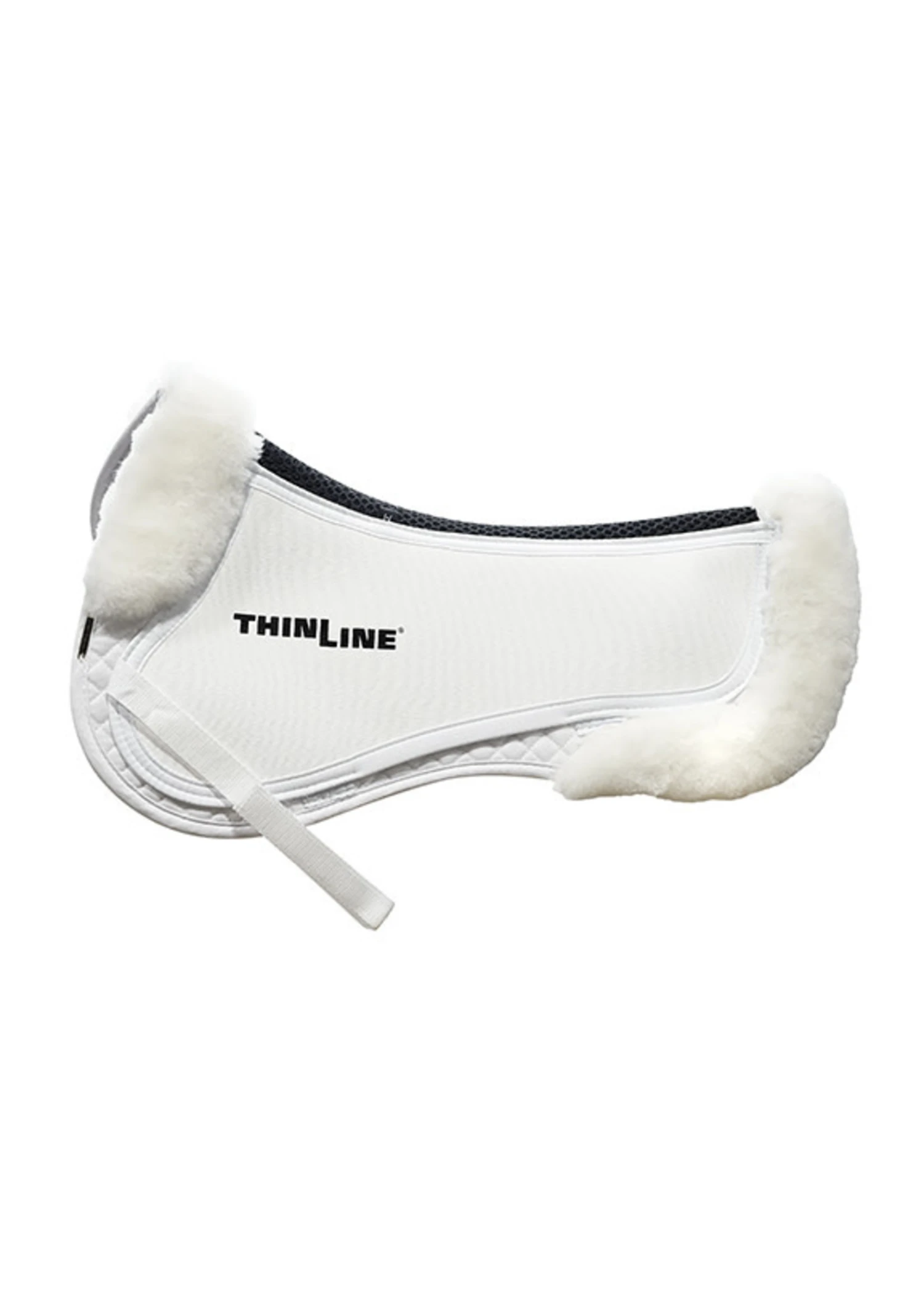 This sheepskin trim half pad is shimmable for customized saddle fit and shims are made of the same trademark foam. The shaped wither profile provides clearance while the ThinLine creates a spine-free channel. 95% shock absorption is provided by the ThinLine foam which also minimizes rider movement for a quieter seat. Sleek design fits under both off the rack and custom saddles allowing for a close contact feel. ThinLine’s open-cell technology provides breath-ability and a non-slip saddle fit.