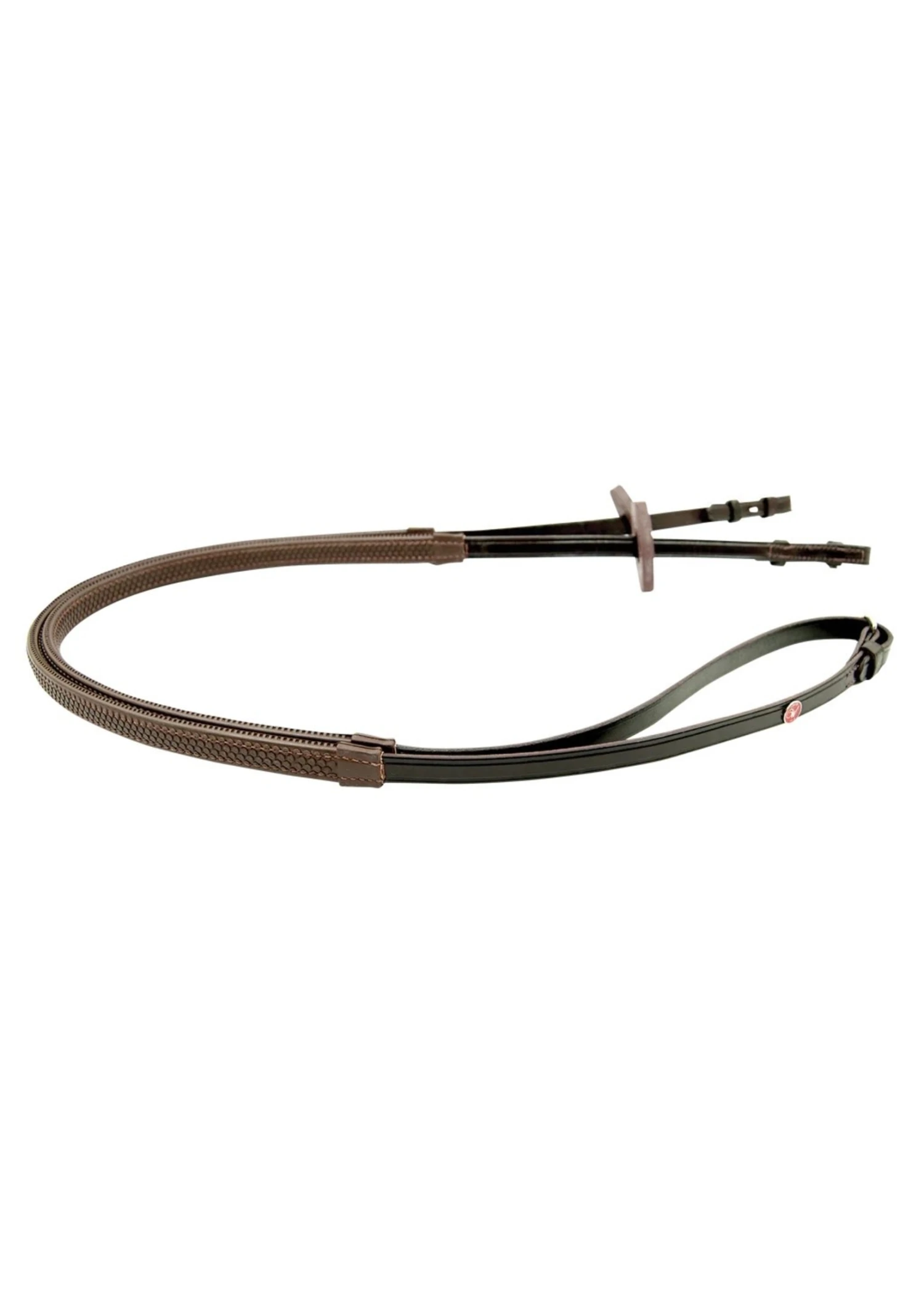 Designed to pair with our Training Headstall for Hunter/Jumpers. Premium English Bridle Leather, high quality rubber grips and Stainless Steel Hardware complete this exceptional set of training reins.